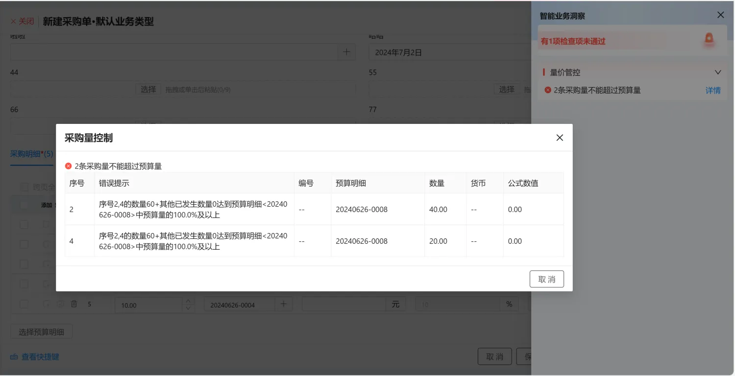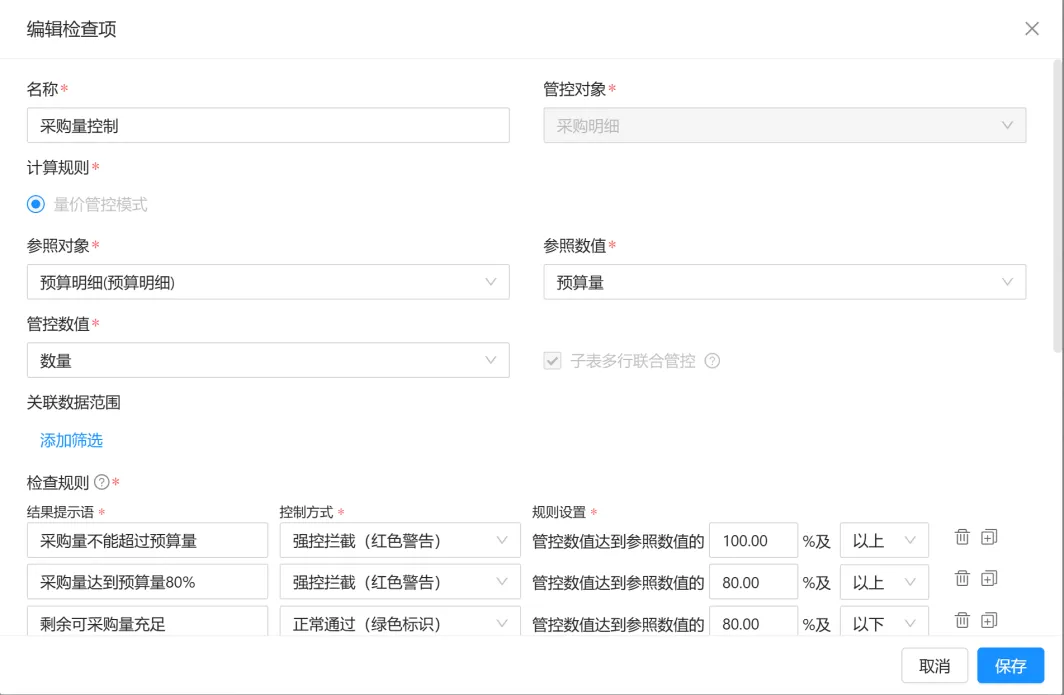 增加对于子对象的管控能力,主要用于支持自主搭建的“预算→申请→支付或领用”量价管控类场景,并且可以做到子表多行联合管控,解决原有验证规则无法支持的问题