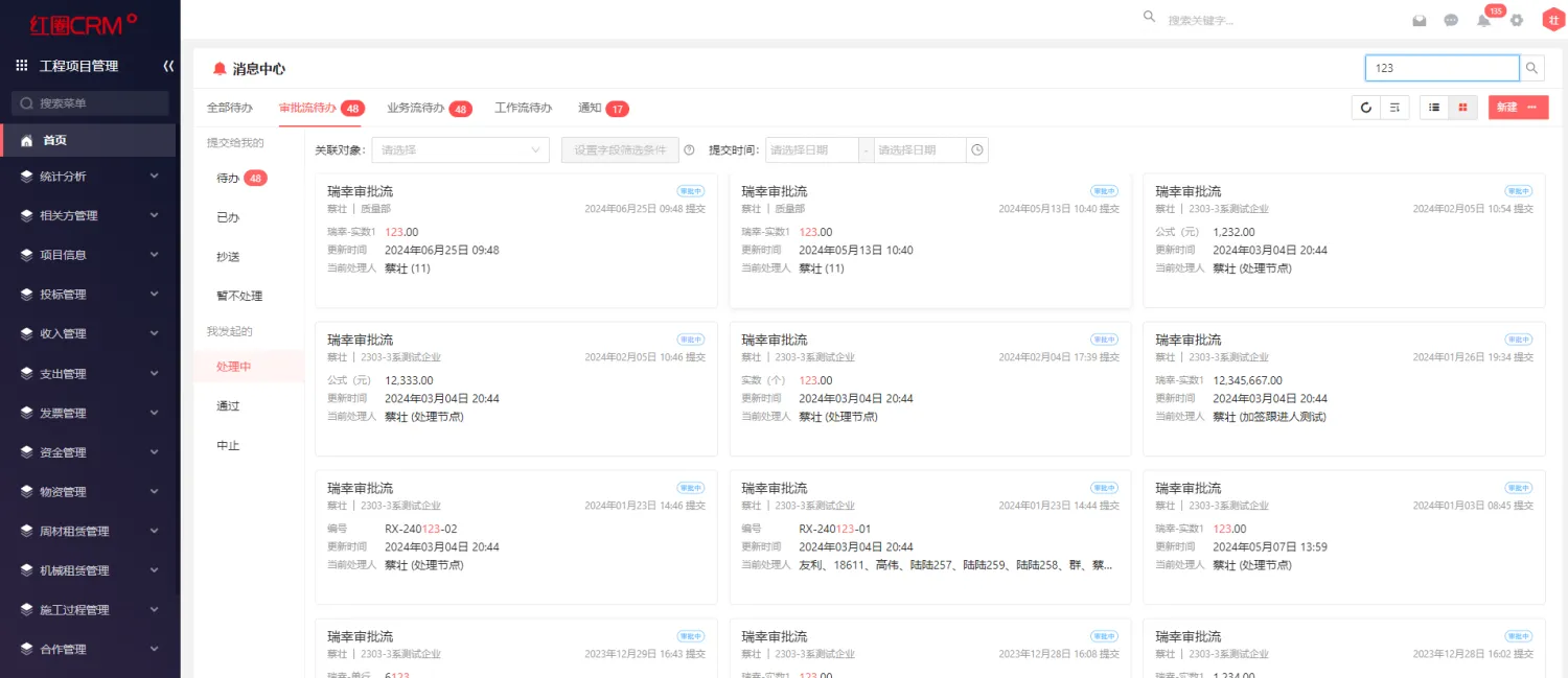 处理中、通过、中止分类卡片列表输入关键词可以对条目进行检索,命中的关键词