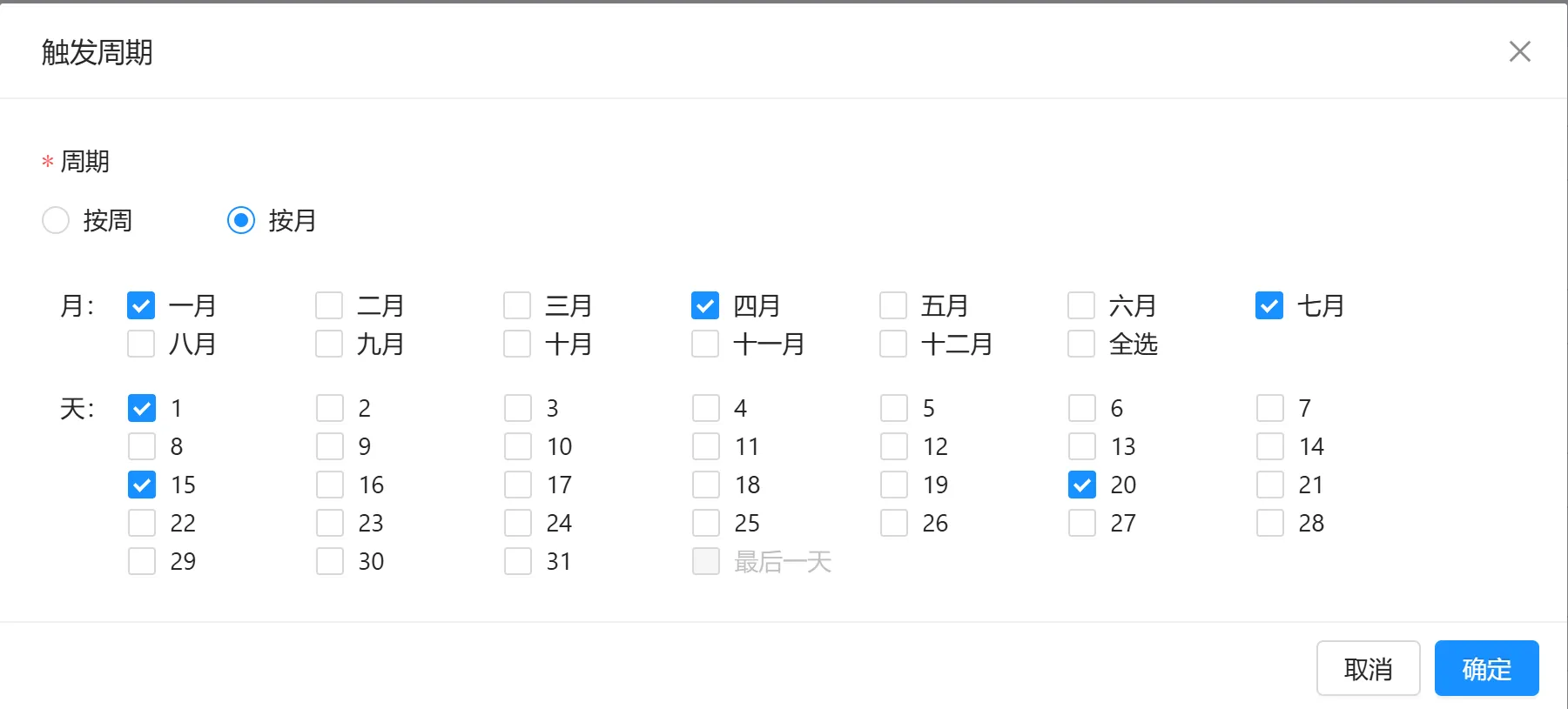 计划增加自定义触发周期,可按周或按月日设置触发频率,提升计划任务的灵活性