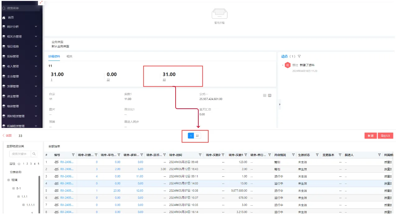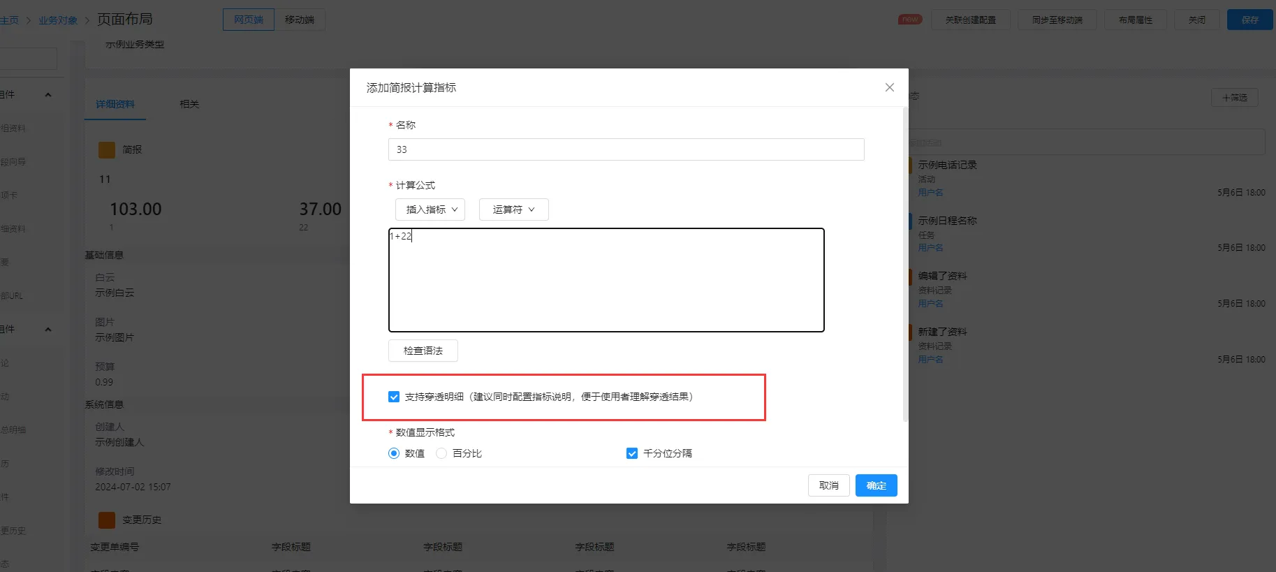 详情页简报中的计算字段勾选支持穿透明细,前台使用时可以穿透查看所有相关指标对应的列表页数据