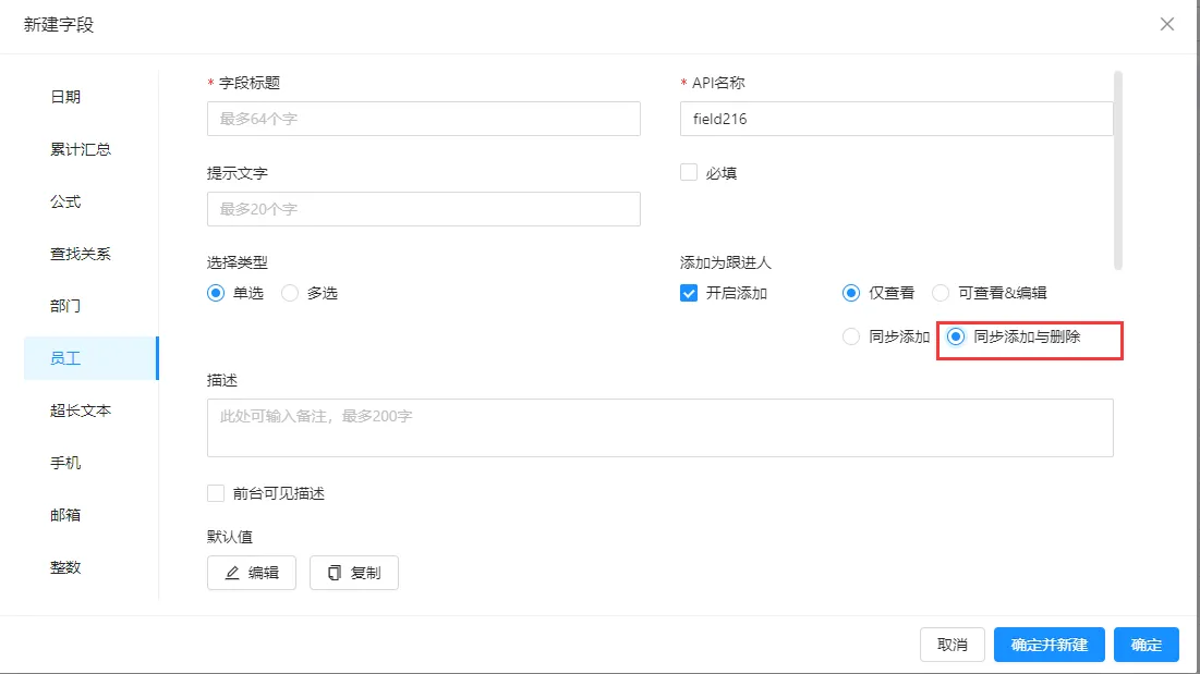 员工字段勾选同步添加跟进人后可以选择同步添加与删除,员工字段中删掉的成员也会同时在跟进人字段中删除