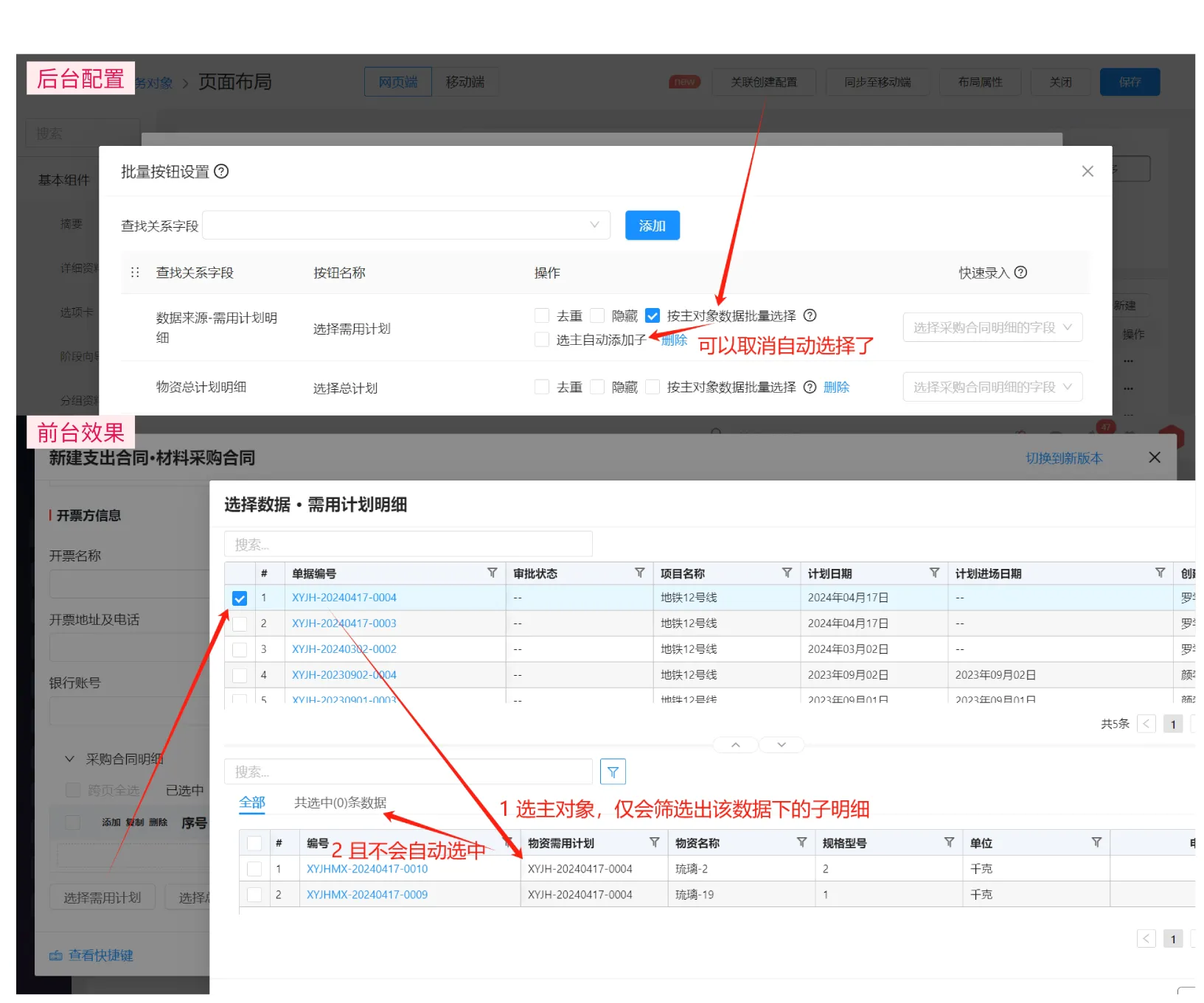6、picker页选主对象同时选中子明细功能,可以设置为不默认选中子,仅作为筛选缩小子明细的范围,方便仅需要选择部分数据的情况
