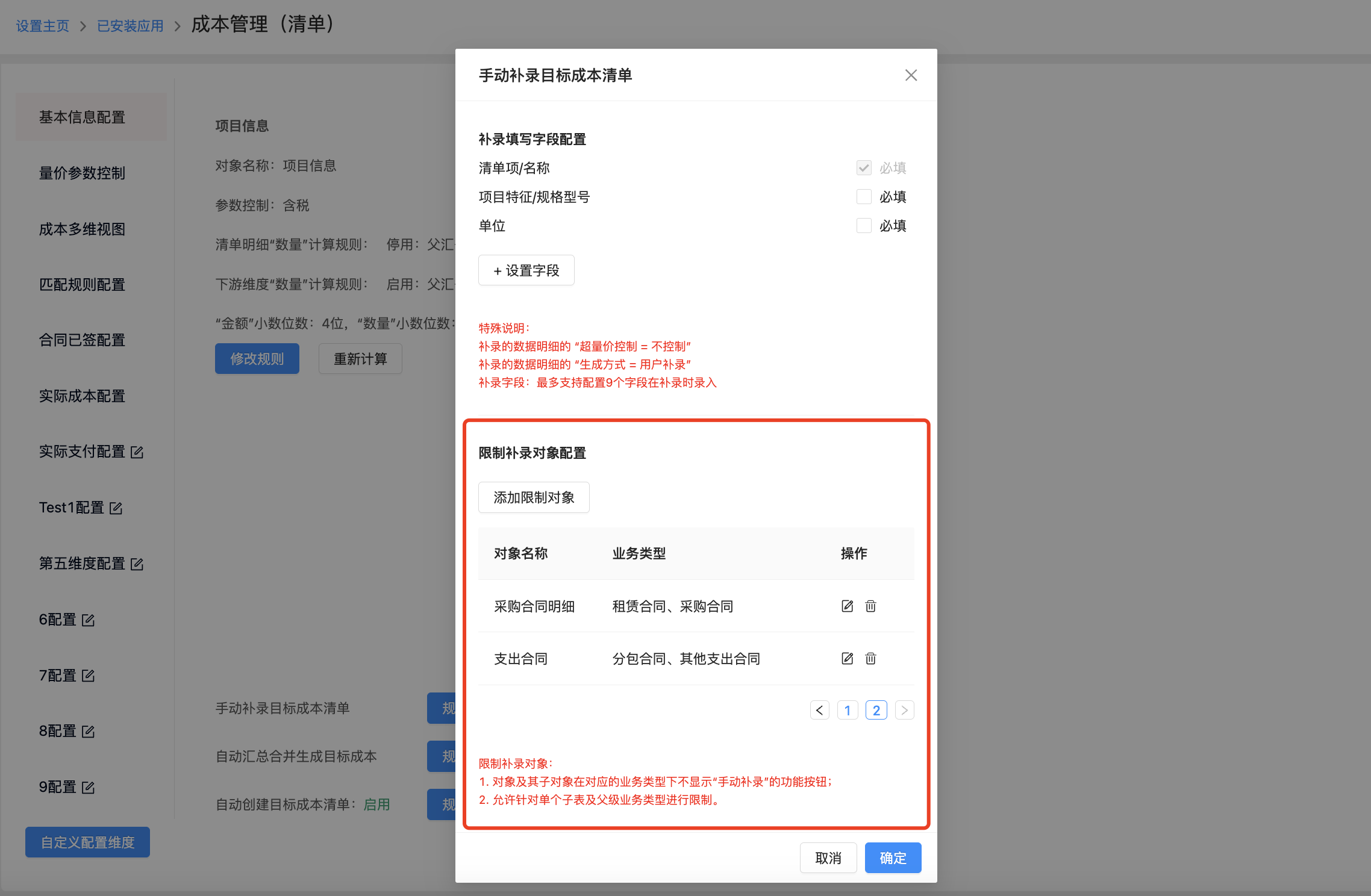 ● 手动补录成本清单明细支持限制范围