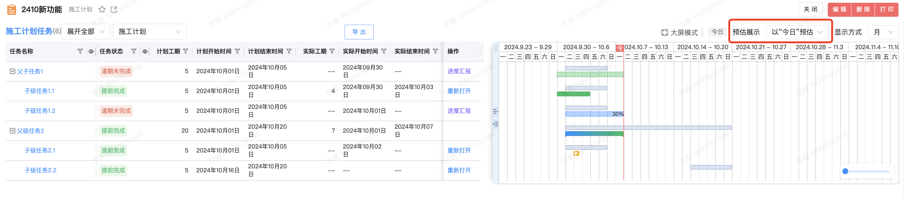 ● 支持以“今日”预估 任务进展的横道图展示