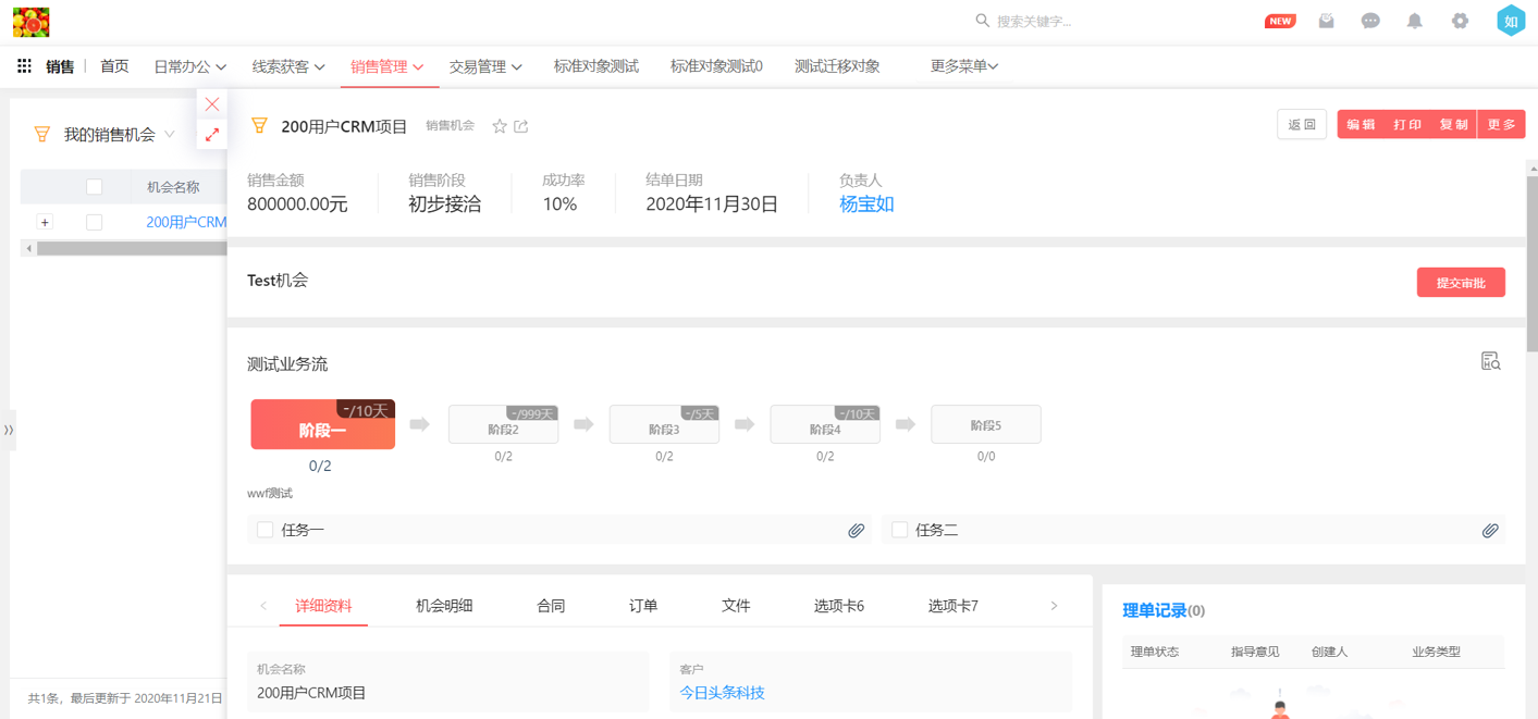在新版本中业务流支持自动流转,使业务流执行起来更加智能高效。通过完成阶段定义里的某个任务自动触发阶段的流转,可以及时提醒员工尽快完成下一阶段的任务,用于多人协作的工作事务进度管理更有效。