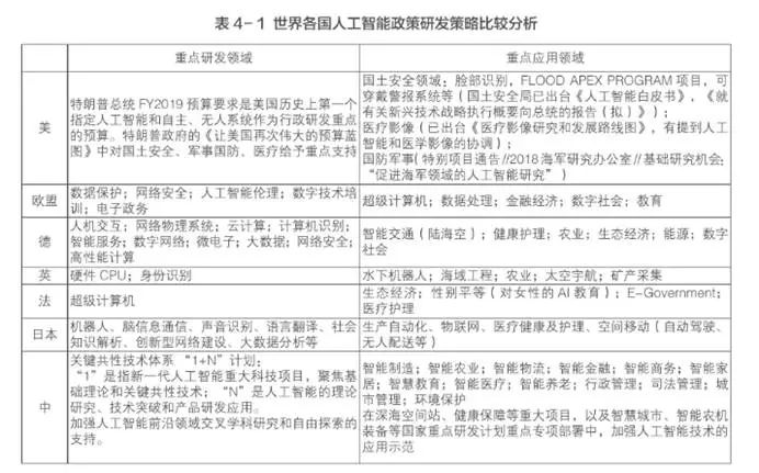 1)国际比较:各国人工智能战略与政策各有重点。中国人工智能政策聚焦于实现人工智能领域的产业化,助力中国的制造强国政策。