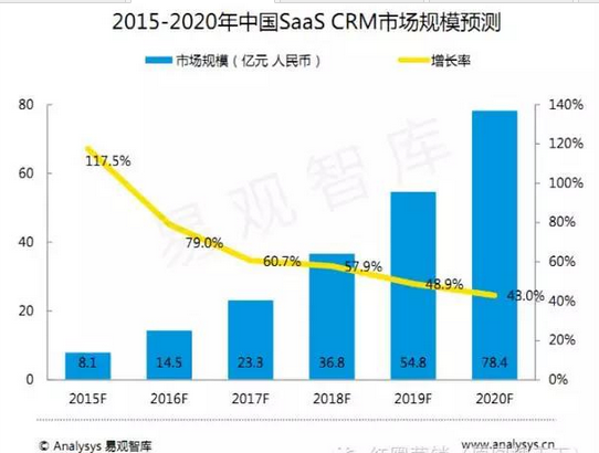 报告指出,国内SaaS CRM市场在2014年的增长率达到了176.9%,市场规模从1.3亿元人民币增长到了3.7亿元人民币,2015年的增长率预计达到117.5%,市场规模增长到8.1亿元人民币。2015-2020年市场还会保持较高速度增长,但是随着市场规模的逐渐扩大,增长将趋于平稳,中国传统中小企业的互联网化转型将成为市场规模增长的主要动力,而随着中国传统中小企业互联网化转型的逐渐完成,SaaS CRM市场的企业数量将保持在一个平稳的水平,市场的规模增长将来源于更加专业以及更加多元化的产品服务。