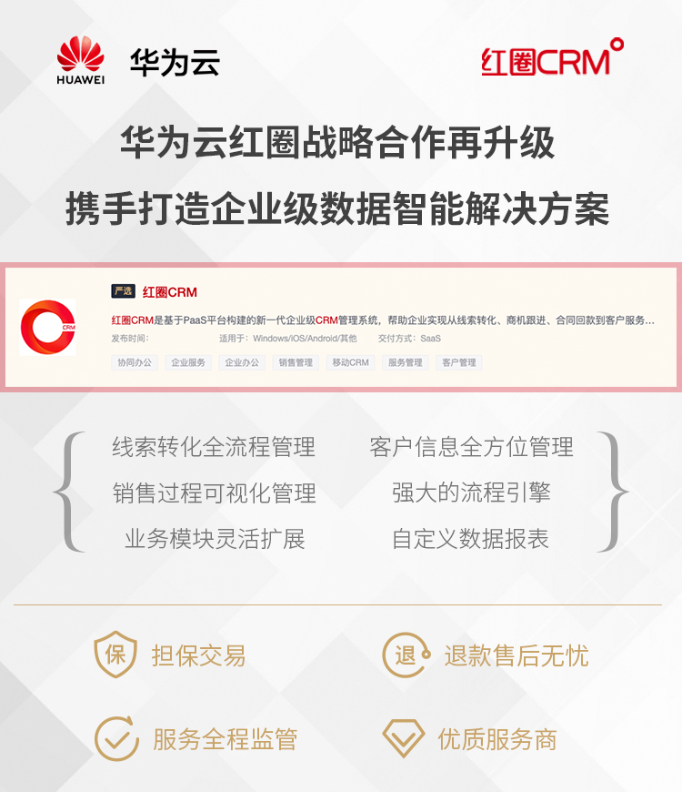 日前,继2019年作为首批加入华为云WeLink的生态伙伴和唯一CRM系统服务商后,红圈与华为云战略合作持续升级,再次在华为云严选商城发布了红圈 CRM企业级移动销售自动化管理系统。旨在基于华为云整体公有云解决方案的基础上,为中大型企业、集团公司用户提供更加优质的数据智能解决方案,帮助企业实现从线索转化、商机跟进、合同回款到客户服务的LTC全流程精细化管理,提升企业竞争力,推动企业业绩增长。