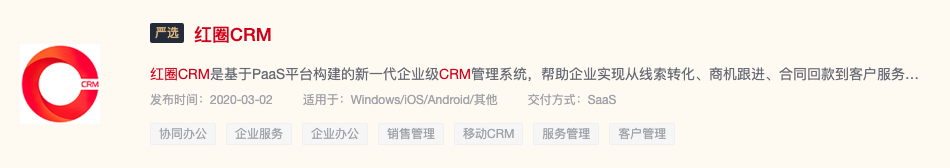 红圈CRM是基于红圈独立研发的PaaS平台上构建的企业级SaaS移动销售管理云服务系统,具备高度的灵活扩展能力,能够帮助企业实现从线索转化、商机跟进到回款管理等LTC销售全流程的精准管理,有效支撑企业复杂的业务场景需求及业务变化。通过面向客户业务的数字化升级需求场景构筑了在移动办公、沟通协作、销售与营销等业务场景解决方案,帮助企业实现了高效的团队协作,大幅提升了组织效能,更加全面地推进了业务进步。