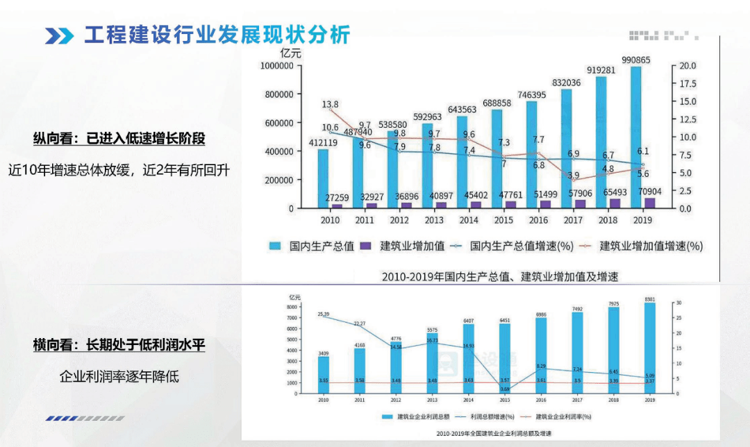 经过对近十年数据的对比分析,可以看出建筑业作为国民经济支柱产业之一,地位依旧稳固。但是如何摆脱利润率偏低的现状、如何提高企业竞争力成为了当今需要探讨的问题。