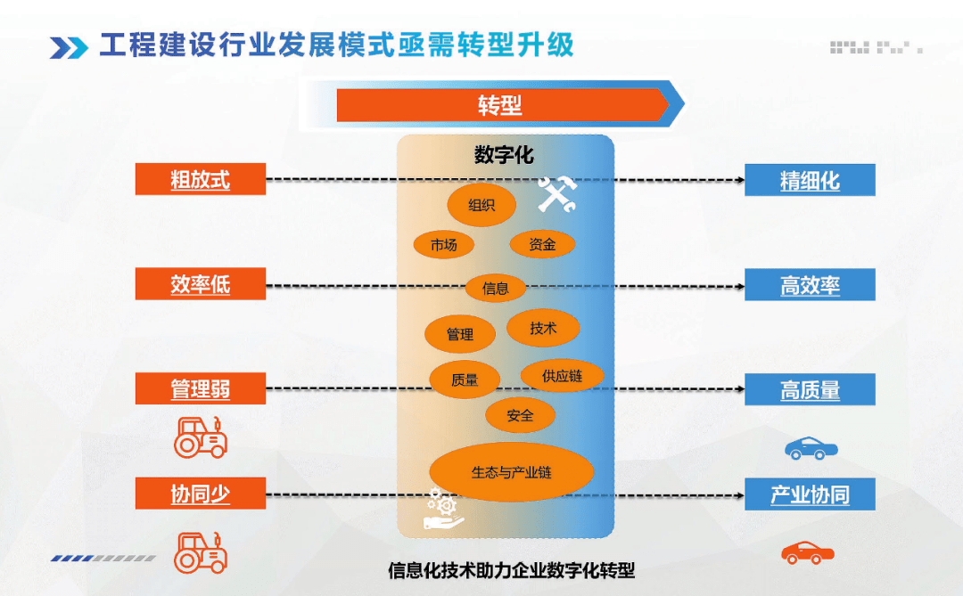 当前行业的现状是粗放式、效率低、管理弱、协同少,建筑企业的发展模式需要转型,信息化需要随着行业的转型而转型,要想高质量发展就需要利用信息科技赋能,信息化、数字化的目的是提高精细化、高效率、高质量、促进产业协同(图2)。