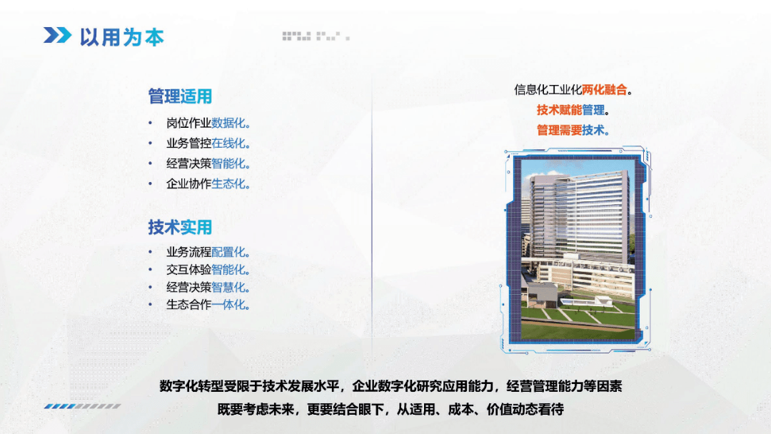 (2)技术实用包括:业务流程配置化、交互体验智能化、经营决策智慧化、生态合作一体化。这些技术是和管理所匹配的,建设企业面临的环境是非常复杂的,在数字化过程中,如何权衡业务、管理和技术,不仅仅是对技术能力的考验,更要把握管理需要什么样的技术匹配。我认为,首先要有一个好的管理平台,在这种平台上,业务骨干、技术人员可以把有限的精力放在如何赋能业务,而不是把时间都耗在加班加点的埋头实现上。我们不能让技术限制住企业的管理,但是很多企业却实实在在的没有用好技术,一方面想利用数字化手段帮助经营,一方面太过于聚焦眼前,没有一个好的规划,导致在实施时往往头痛医头,脚痛医脚,并没有从根本上解决企业的管理问题。要想做好这些,一个强大的业务骨干团队、一个落地能力很强的技术团队、一个强大有力耐得住寂寞的决心都是非常重要的。业务的变化在所难免,我们运用数字化手段,降低各种变化所带来的企业阵痛,用好技术平台并不仅是针对当前模式能用好,更要在未来多变的商业环境中,企业姿态发生调整时,依然能够快速响应,这样的技术平台才是我们需要提前规划好的事情。而从业务流程配置化、交互体验智能化、经营决策智慧化、生态合作一体化也是这种技术平台能够支持和解决的,这些点也是我们在选择技术平台前所必须考量的具体内容。