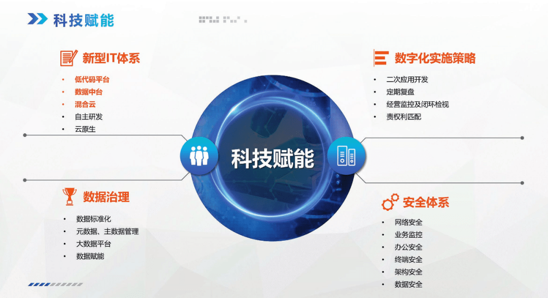 要实现科技赋能,首先要考虑科技赋能的基础设施,这有四个方面:一是新型IT体系、二是数据治理、三是安全体系、四是数字化实施策略(图11)。