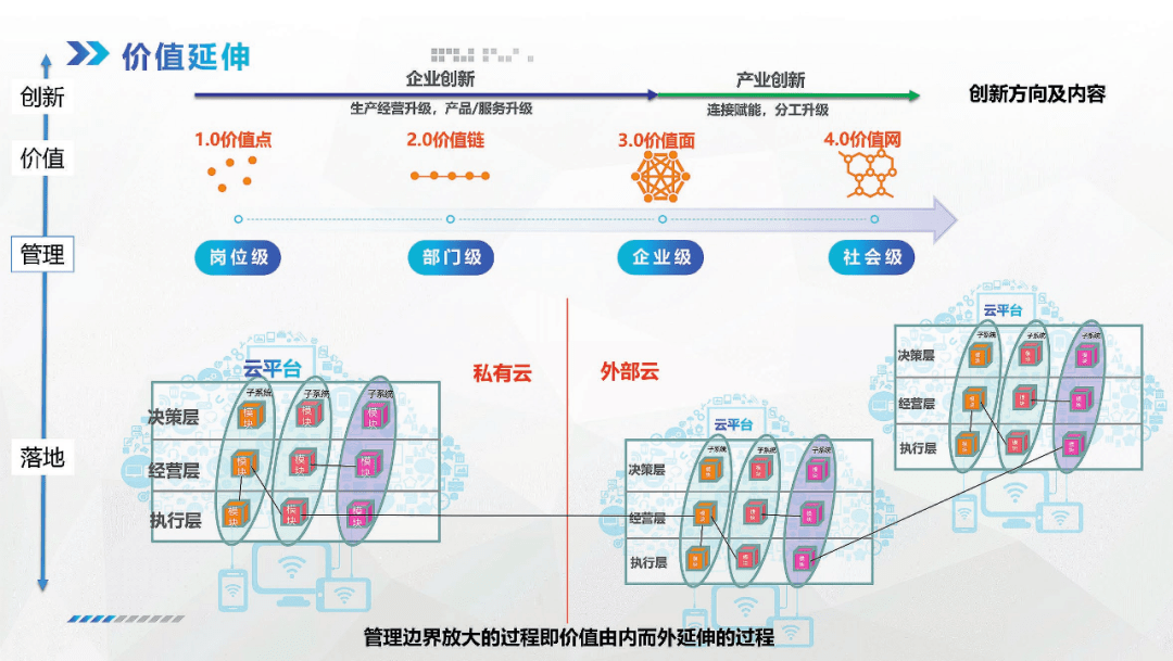 从管理到落地,可以将企业内部的各类系统经过抽象后统称为该企业的“一朵云”(平台),这个“云平台”的组成包括:系统(系统之下可以有子系统)、管理模块、工作单元、工作场景、管理节点和管理信息因子。从图中可以看出系统内部的模块间、系统之间的模块间都是有关联的。企业的“云平台”部署在私有云,而生态伙伴的“云平台”部署在外部云,每朵“云”之间借助模块的关联形成了一个合作体系。随着这种体系落地的过程,实现了价值向外的延伸、也实现了管理的向外延伸,管理边界的放大过程就是价值由内而外延伸的过程。数字化转型不仅仅是“一朵云”落地,云和云之间互联互通。