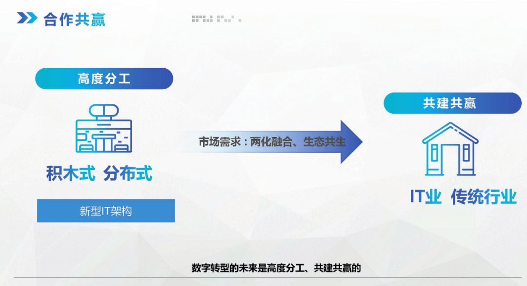 数字化转型的未来是高度分工、共建共赢的,在新型IT架构体系下,未来的系统可以是积木式、分布式的,高性能、高响应、低成本、低门槛将是科学技术发展的方向。