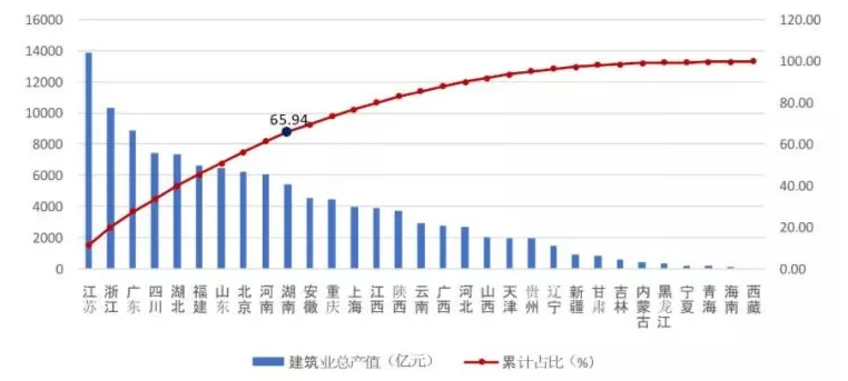 除江苏、浙江外,总产值超过5000亿元的还有广东、四川、湖北、福建、山东、北京、河南、湖南8个地区,上述10省市完成的建筑业总产值占全国建筑业总产值的65.94%(图1)。