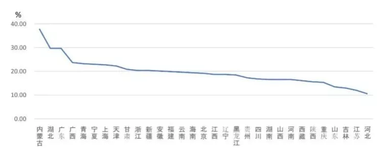从各地区建筑业总产值增长情况看,所有地区的建筑业总产值较上年同期都有不同幅度的增长。其中,内蒙古的增幅最大,达到了37.93%,此外,湖北、广东、广西、青海、宁夏、上海、天津、甘肃、浙江、新疆、安徽等11个地区的增幅均超过20%(图2)。