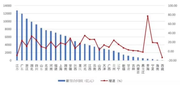 2021年上半年,江苏、广东、浙江三地区建筑业企业新签合同额均超过10000亿元,分别为12763.52亿元、11925.7亿元、10702.53亿元。此外,新签合同额超过6000亿元的还有湖北、四川、山东、北京、河南、福建、上海、湖南等8个地区(图3)。新签合同额同比增长最快的是青海,达到77.15%。此外,河北、湖北、安徽、云南、江西、四川、贵州、广东、河南等9个地区的增幅均超过20%。西藏、江苏、黑龙江3个地区新签合同额出现负增长,其中西藏的负增长超过了10%。