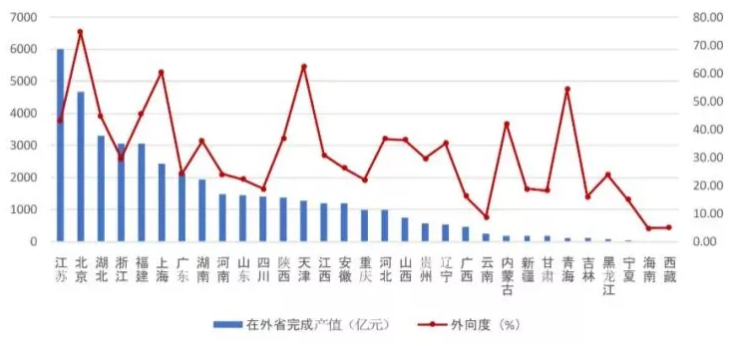 图4 2021年上半年各地区跨省完成的建筑业总产值及外向度