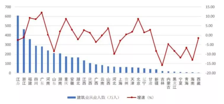 图5 2021年上半年各地区建筑业从业人数及其增长情况