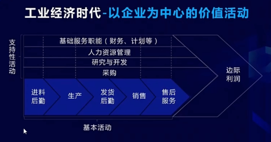 在迈克尔波特的价值链理论中企业整个的价值链的价值是由基本活动来实现的,或者生产,或者销售,或者供应,或者服务,或者渠道。然后支持性的活动是保证价值活动效率和成本最佳,所以你会发现整个价值是一个链条产生的。
