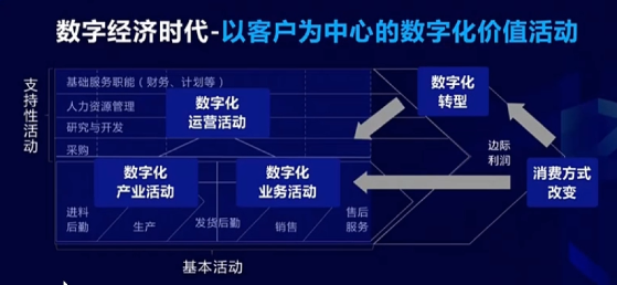 数字时代的来临带来的最大变化是什么?支持性活动可以产生价值,基本活动也可以产生价值,整个上下游还是可以产生价值。最后发现我们产生价值的空间变多了。原来只在一条链上,而且这条链上只有基本活动产生价值,其他只是改变成本和价值。可是数字技术来了之后,所有的环节都可以产生价值,无论是支持活动、基本活动,还是上下游的产业活动。我们告诉各位,这是源于消费方式的改变。