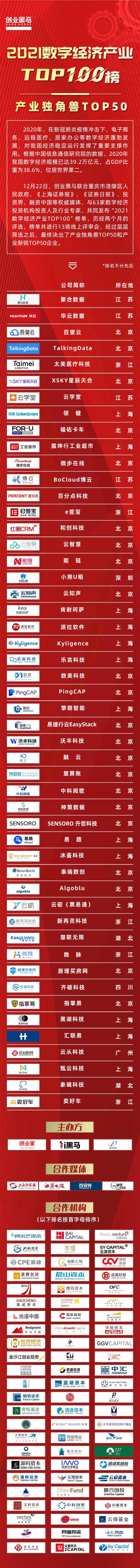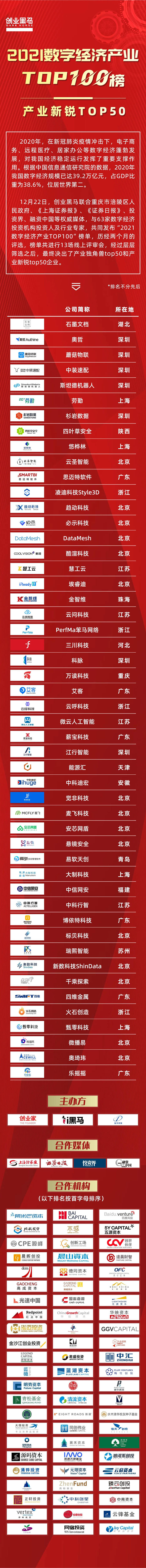 基于此,12月22日创业黑马联合重庆市涪陵区人民政府、《上海证券报》、《证券日报》、投资界、融资中国等权威媒体,与63家数字经济投资机构投资人及行业专家,共同发布“2021数字经济产业TOP100”榜单。