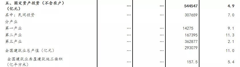 分产业看,第一产业投资14275亿元,比上年增长9.1%;第二产业投资167395亿元,增长11.3%;第三产业投资362877亿元,增长2.1%。
