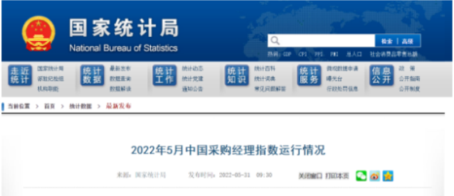 近日,国家统计局发布2022年5月中国采购经理指数运行情况。