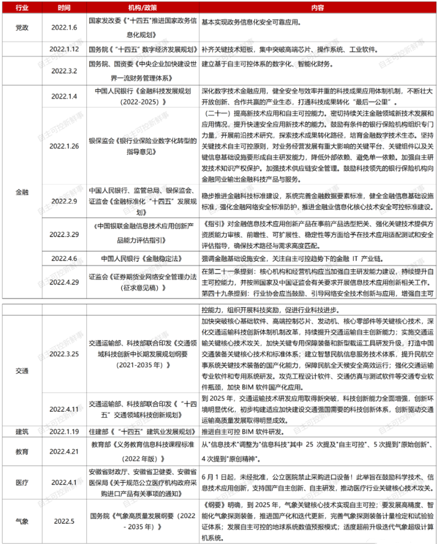 以下为2022年上半年顶层设计对“信创、国产化”的相关政策汇总: