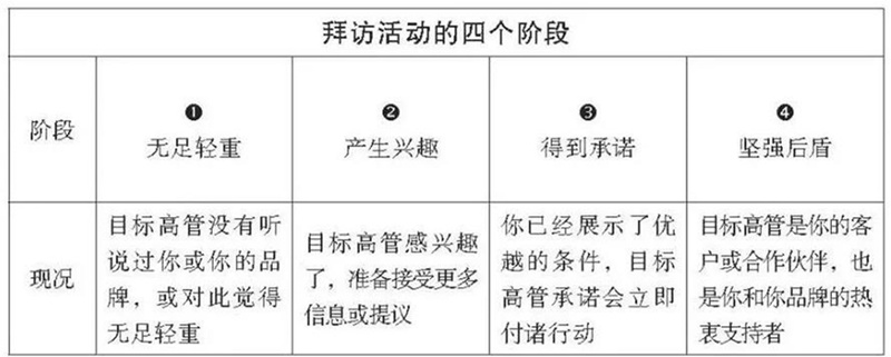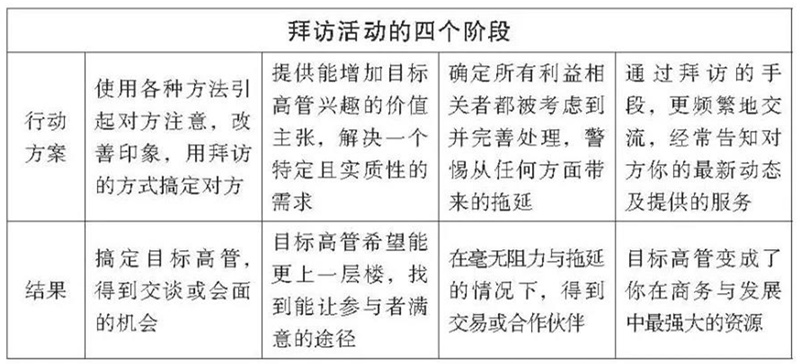 亚马逊创始人杰夫· 贝佐斯有句很出名的话:“一个人的品牌就是人们背着他时做的评论。”拜访工作能直接影响他人,尤其是处于第四阶段的目标高管对你的评论。难道持续地提供你的信息并与他们保持联系不是最合情合理的策略吗?当然是。