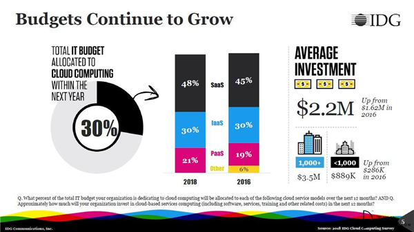 企业预计它们今年在云apps、平台和服务中的评价投入为350万美元。在接下来一年预算的分配中,30%分配给了云计算,其中大部分是SaaS(48%)、IaaS(30%)和PaaS(21%)。同时,对云计算应用和平台的投资也在快速提升,对此企业的平均投资额达到220万美元,高于2016年的162万美元。