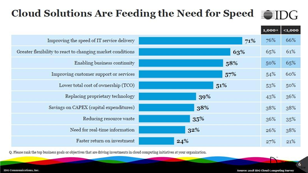 76%的大型企业正在寻求云应用和平台以加速IT服务的交付。多年来,云计算已经被视作是一个降低成本的优先策略,现在它已经成为数字化业务模式的推动者。IT部门要求快速交付云应用及平台组件的期望与压力从未如此之高。而云投资的目的是为企业带来更大的灵活性,以及它们对不断变化的市场环境做出反应的能力(63%的全体受访者对此表示同意),从而推进数字化业务模式的实现。