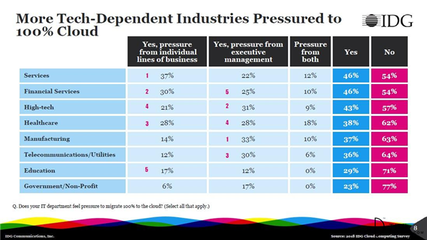 在所有行业中,制造业、高科技和电信/公共事业从业者面临着最大的高层压力,他们被要求实现100%的云计算。简化复杂的制造过程,并提供一个从车间到公司顶层的统一记录系统的综合云平台,是上述三个技术驱动型行业高管管理的重中之重。而实现更好的供应商质量管理、可见性、更好的制造计划、工作流优化、实现和客户交付是云平台能促进制造业增长的数个领域。