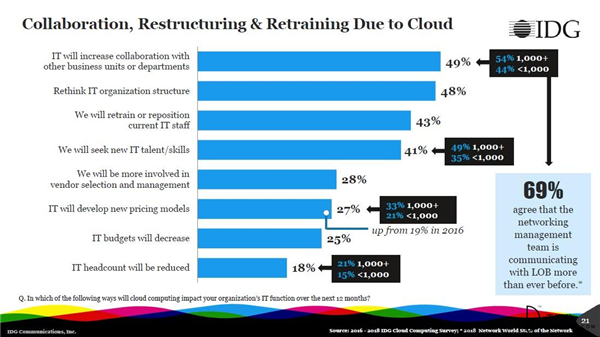 54%的大型企业表示,作为云投资的结果,它们必须增加与其他业务部门的合作。而在所有规模的组织中,48%的受访者表示云迫使它们重新考虑自身的IT组织结构。其他的变化包括留存和重新定位当前的IT员工,雇佣更多的云技能人才,以及参与全新的供应商选择和管理体系中。