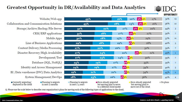 在所有的云应用领域与迁移中中,数据分析和灾难恢复具有最大的机会。49%的组织计划在未来一年到三年中将灾难恢复/高可用性系统迁移到云端。而45%的组织计划在未来一年到三年中将BI、数据仓库和数据分析应用迁移到云。目前,云计算正被视为一种增长催化剂,它所支持的应用程序正在消除企业收入增长的障碍,并帮助它们在稳定运营的同时获得新客户。