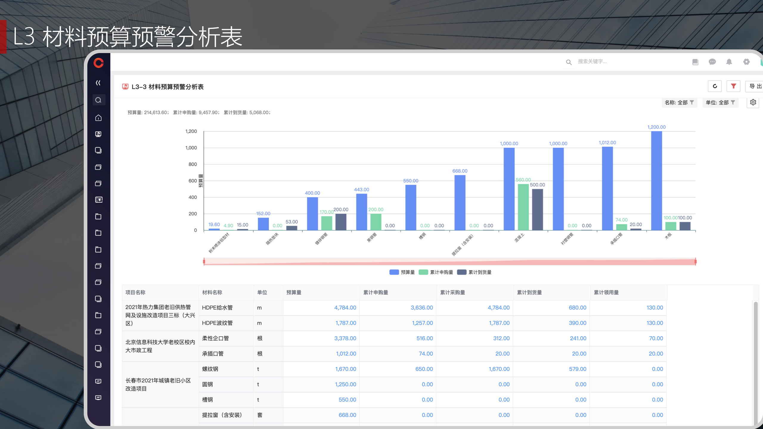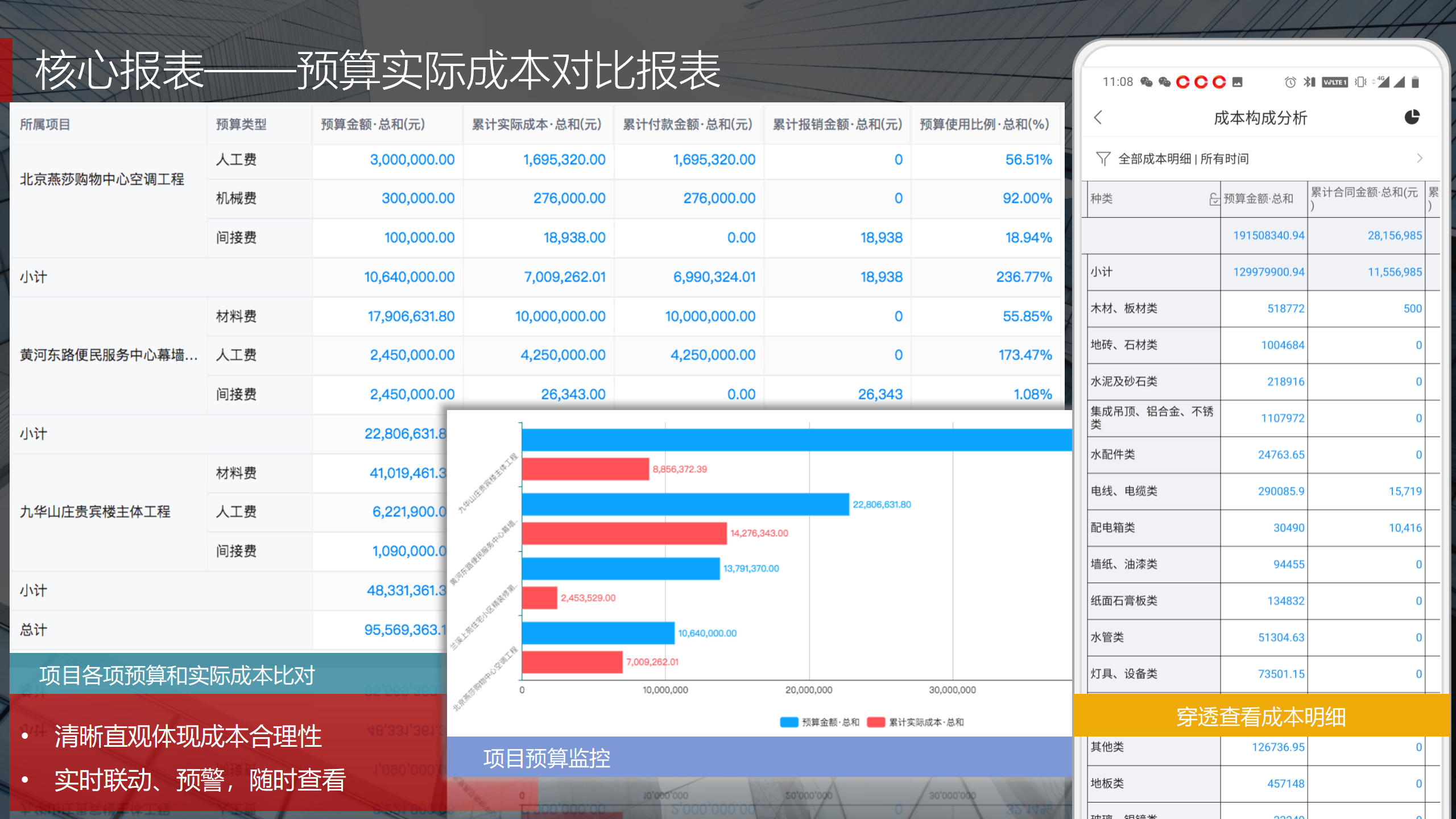 红圈系统在PaaS平台基础上,根据工程项目管理的实际情况,通过人力资源管理、资金管理、成本管理、物资管理、安全质量管理、招投标管理、合同管理、劳务管理等功能模块,利用报表引擎实时动态抓取项目管理过程中的相关数据,实时动态展现公司整体项目运营情况。当某项科目设定额度一旦超出计划指标时,系统会自动发送动态预警。为公司领导决策实时呈现动态智能数据分析,让公司领导实时了解工程项目的整体运营效率及效益是否达标,经营风险是否可控,真正做到项目管理心中有“数”,满足公司对信息化管理的需求,提升公司经营管理能力,实现工程项目全过程管理的降本增效。