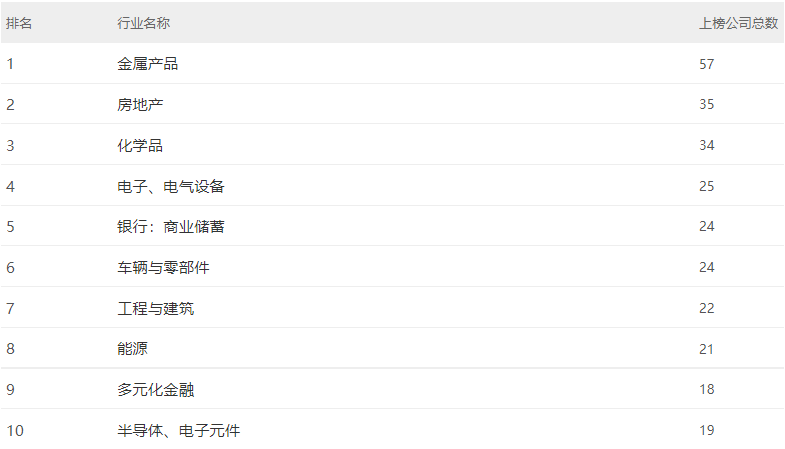 据上图所示,根据上榜公司总数排名,工程与建筑行业公司总数为22,位列第七。