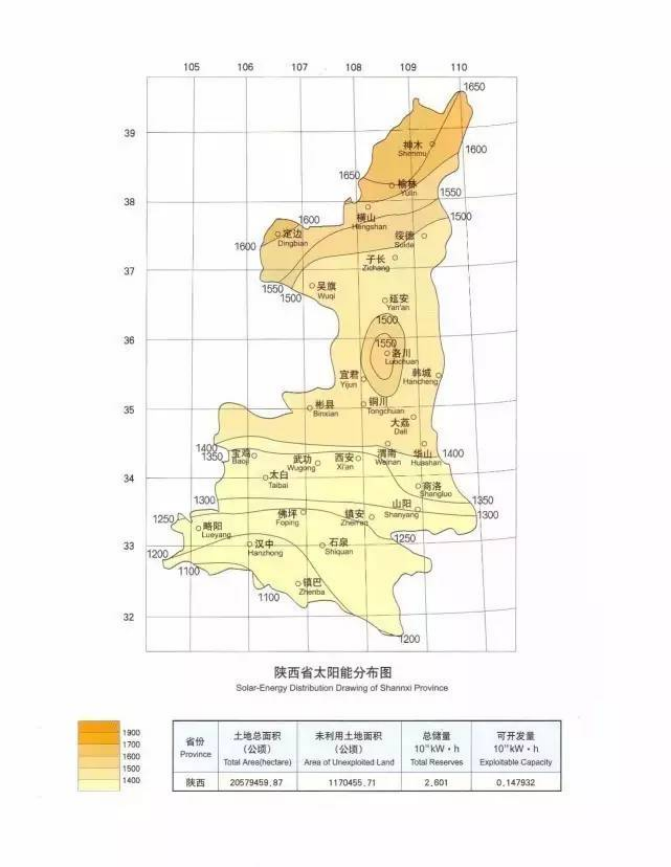 陕西省具有丰富的太阳能资源,太阳能资源空间分布特征是北部多于南部,全省太阳能年总辐射量在4410~5400MJ/m2之间。初步推算,陕西的太阳能资源经济技术可开发量大约1.1亿千瓦。