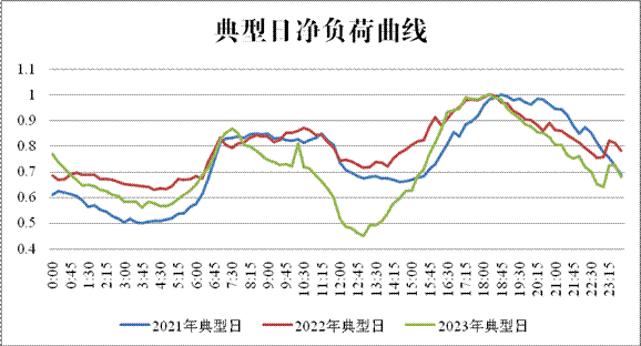 由于湖南光伏发电装机的快速增长,湖南电网净负荷曲线(电网净负荷=电网负荷-新能源出力-外受电)产生向“鸭子型曲线”转变的趋势(见图),午间腰荷时段净负荷越来越低,该时段可再生能源消纳困难情况开始显现。以2023年某日为例,该日光伏发电出力较大,腰荷时段电网净负荷较前两年同期明显下降,同时低于当日低谷时段净负荷,导致腰荷时段新能源消纳更为困难。
