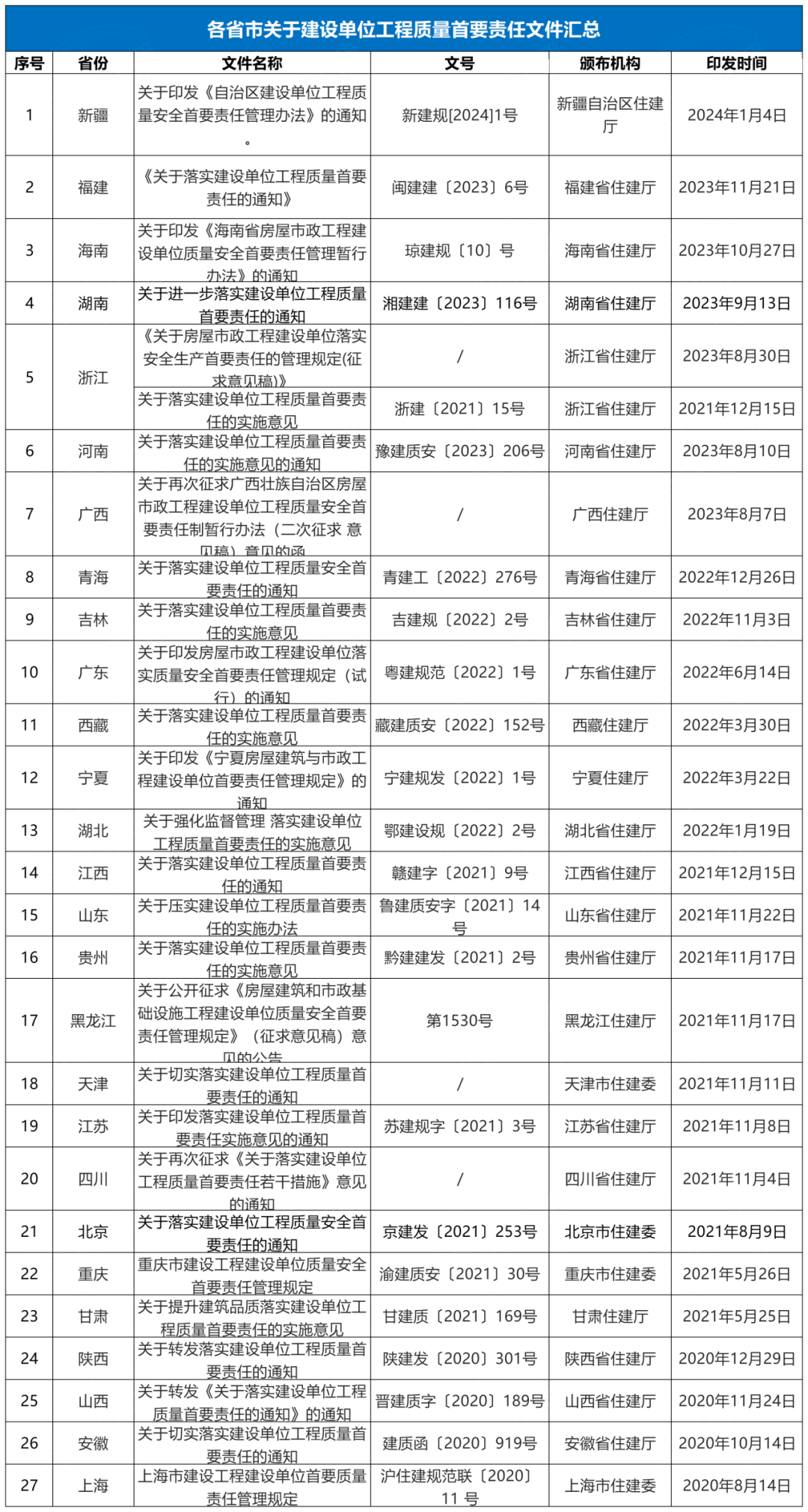 截至目前,27省市已经发文跟进住建部《关于落实建设单位工程质量首要责任的通知》(建质规〔2020〕9号),严格落实建设单位工程质量首要责任。