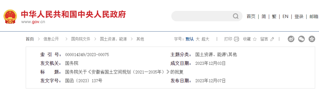 国务院关于《安徽省国土空间规划
