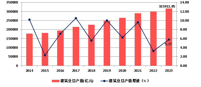 2014年以来,随着我国建筑业企业生产和经营规模的不断扩大,建筑业总产值持续增长,2023年达到315911.85亿元,比上年增长5.77%。增速较上年提高2.52个百分点(图3)。