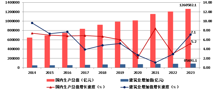 图1 2014-2023年国内生产总值、建筑业增加值及增速