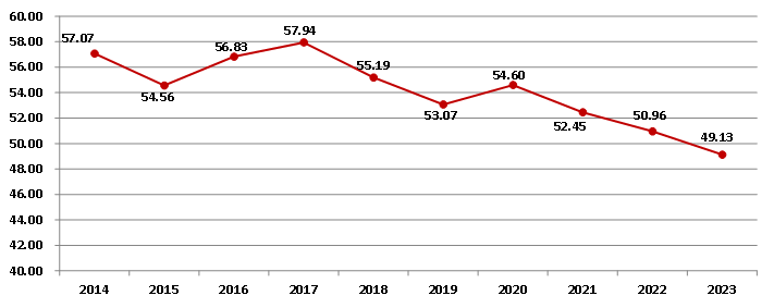 图11 2014-2023年全国建筑业企业新签合同额占合同总额比例