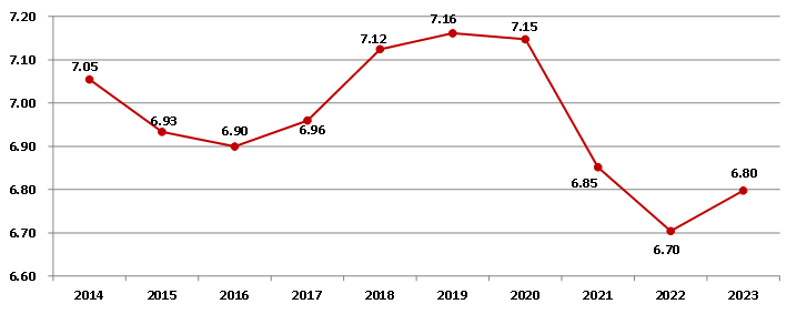 自2014年以来,建筑业增加值占国内生产总值的比例始终保持在6.70%以上,2023年为6.80%(图2),建筑业国民经济支柱产业的地位稳固。