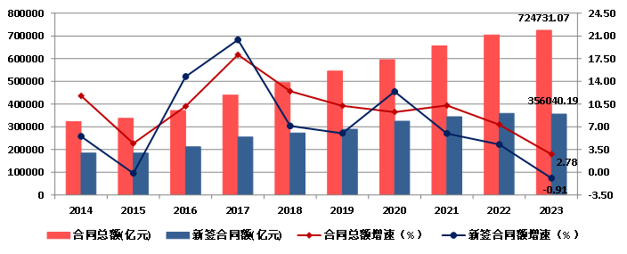 图10 2014-2023年全国建筑业企业签订合同总额、新签合同额及增速