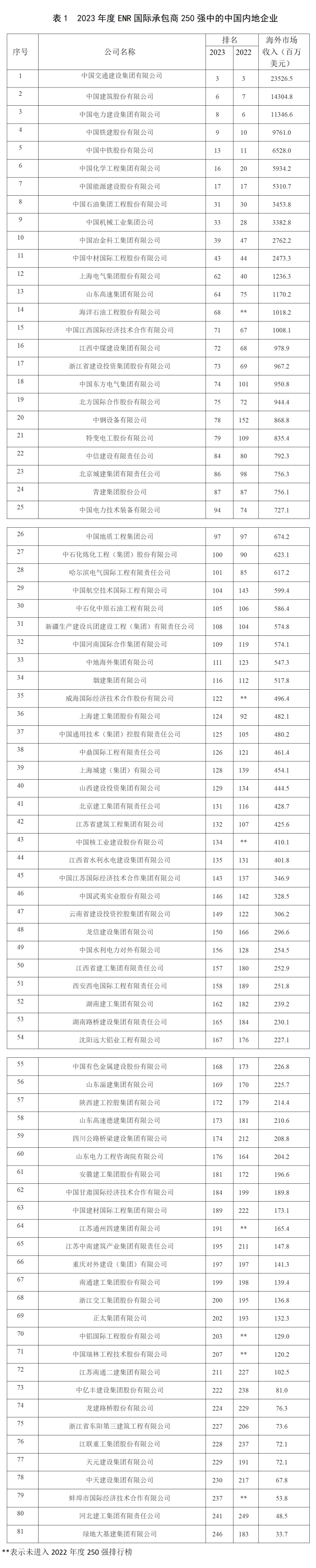 在 2023 年度国际承包商 10 强中,中国内地仍保持 4 家企业的记录,分别是保持季军的中国交通建设集团有限公司,排名前进到第 6 位的中国建筑股份有限公司,排名第 8 位的中国电力建设集团有限公司,以及排名前进 1 位来到第 9 位的中国铁建股份有限公司。进入2023年度国际承包商百强榜中的内地企业有27家,数量较上一年度增加1家;新入榜内地企业有7家,排名上升的有35家,其中升幅最大的是中钢设备有限公司,排名前进74位排在了第78位(表1)。