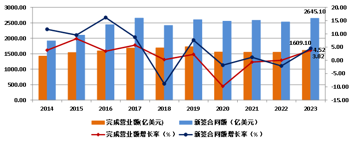 2023年,我国对外承包工程业务完成营业额1609.1亿美元,比上年增长3.83%,新签合同额2645.1亿美元,比上年增长4.52%(图14)。