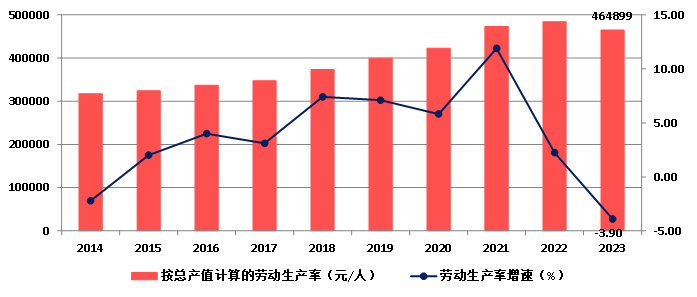 2023年,按建筑业总产值计算的劳动生产率为464899元/人,比上年下降3.90%,增速比上年降低6.14个百分点,增速连续两年下降(图8)。